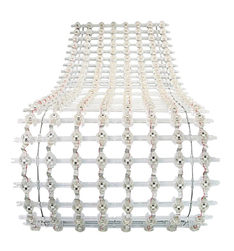 LED折叠屏跟业内的常规箱体屏不同,我们直接摈弃笨重的箱体,模组与模组间用钢丝绳做窜连,模组与模组间排线的连接,以焊线的方式,不管屏幕如何翻转,折叠,都不会出现松动、信号转输不稳定的情况。